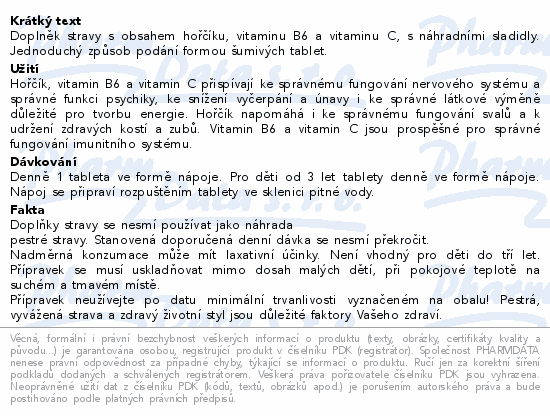 Doplněk stravy s obsahem hořčíku, vitaminu B6 a vitaminu C, s náhradními sladidly. Jednoduchý způsob podání formou šumivých tablet.
