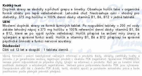 Doplněk stravy se sladidly s příchutí grepu a limetky. Obsahuje hořčík také v organické formě citrátu pro lepší vstřebatelnost. Lahodná chuť. Neobsahuje cukr - vhodný pro diabetiky. 375 mg hořčíku + 100% denní dávky vitamínů B1, B6, B12 v jedné tabletě.