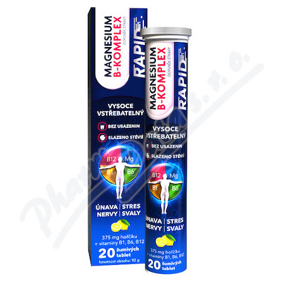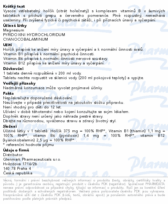 Vysoce vstřebatelný hořčík (citrát hořečnatý) s komplexem vitaminů B v šumivých tabletách s příchutí grepu a červeného pomeranče. Plně rozpustný, nenechává usazeniny. Při zvýšené fyzické či psychické zátěži, i při příznacích únavy a vyčerpání.