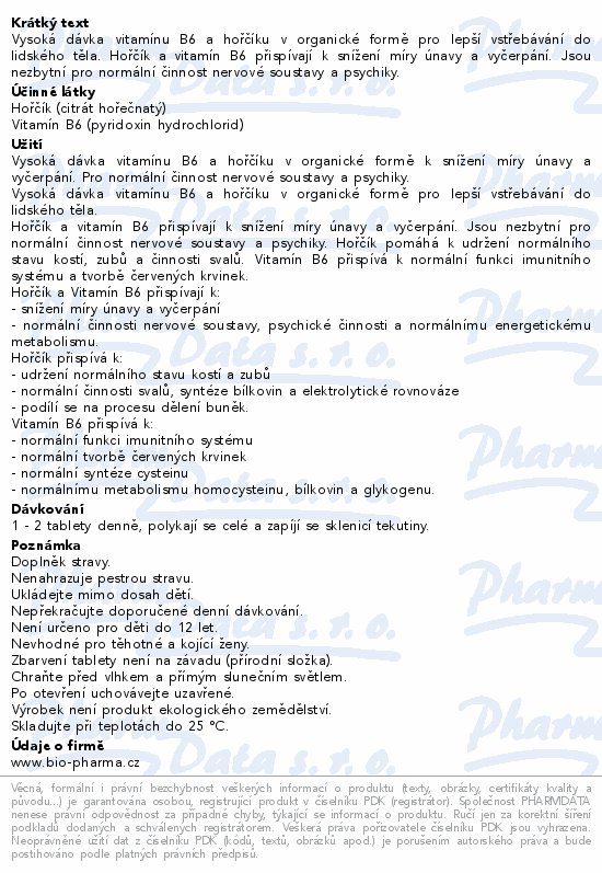 Vysoká dávka vitamínu B6 a hořčíku v organické formě pro lepší vstřebávání do lidského těla. Hořčík a vitamín B6 přispívají k snížení míry únavy a vyčerpání. Jsou nezbytní pro normální činnost nervové soustavy a psychiky.