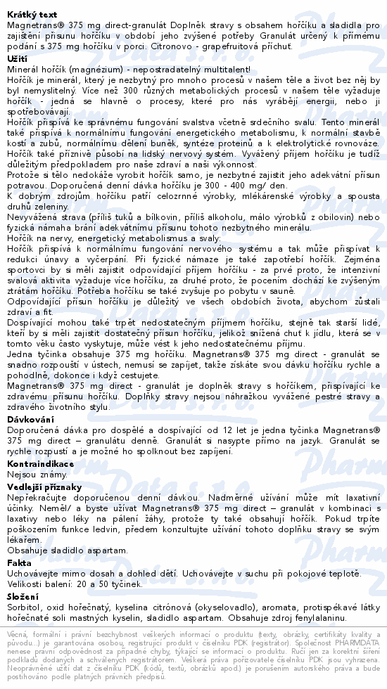 Magnetrans® 375 mg direct-granulát Doplněk stravy s obsahem hořčíku a sladidla pro zajištění přisunu hořčíku v období jeho zvýšené potřeby Granulát určený k přímému podání s 375 mg hořčíku v porci. Citronovo - grapefruitová příchuť.