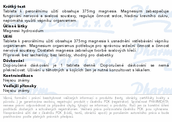Tableta k perorálnímu užití obsahuje 375mg magnesia. Magnesium zabezpečuje fungování nervové a svalové soustavy, reguluje činnost srdce, hladinu krevního cukru, napomáhá využití vápníku organismem.