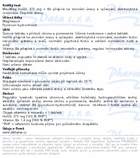 MaxiMag hořčík 375 mg + B6 přispívá ke zmírnění únavy a vyčerpání, elektrolytické rovnováze. Doplněk stravy.