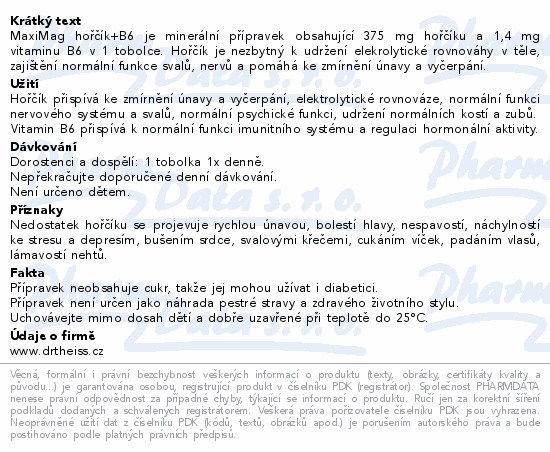 MaxiMag hořčík+B6 je minerální přípravek obsahující 375 mg hořčíku a 1,4 mg vitaminu B6 v 1 tobolce. Hořčík je nezbytný k udržení elekrolytické rovnováhy v těle, zajištění normální funkce svalů, nervů a pomáhá ke zmírnění únavy a vyčerpání.