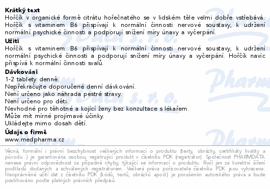 Hořčík v organické formě citrátu hořečnatého se v lidském těle velmi dobře vstřebává. Hořčík s vitaminem B6 přispívají k normální činnosti nervové soustavy, k udržení normální psychické činnosti a podporují snížení míry únavy a vyčerpání.