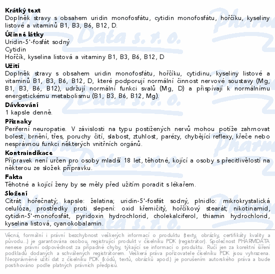 Doplněk stravy s obsahem uridin monofosfátu, hořčíku, cytidinu, kyseliny listové a vitaminů B1, B3, B6, B12, D.