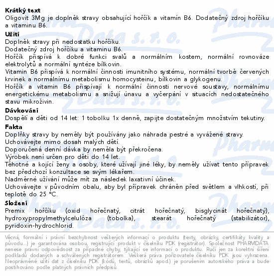Oligovit 3Mg je doplněk stravy obsahující hořčík a vitamín B6. Dodatečný zdroj hořčíku a vitaminu B6.