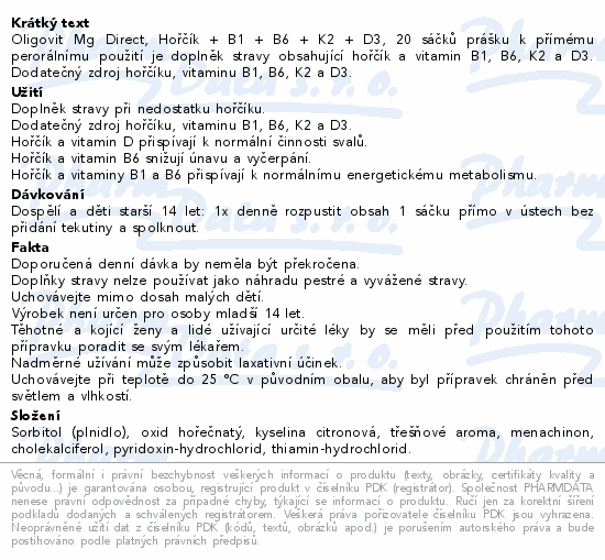 Oligovit Mg Direct, Hořčík + B1 + B6 + K2 + D3, 20 sáčků prášku k přímému perorálnímu použití je doplněk stravy obsahující hořčík a vitamin B1, B6, K2 a D3. Dodatečný zdroj hořčíku, vitaminu B1, B6, K2 a D3.