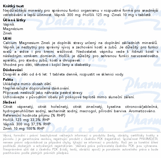 Nejdůležitější minerály pro správnou funkci organismu v rozpustné formě pro snadnější vstřebávání a lepší účinnost. Vápník 300 mg -Hořčík 125 mg -Zinek 10 mg v tabletě.