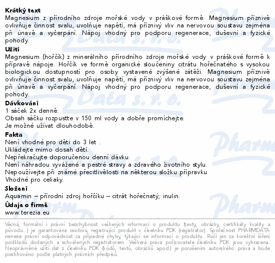Magnesium z přírodního zdroje mořské vody v práškové formě. Magnesium příznivě ovlivňuje činnost svalu, uvolňuje napětí, má příznivý vliv na nervovou soustavu zejména při únavě a vyčerpání. Nápoj vhodný pro podporu regenerace, duševní a fyzické pohody.