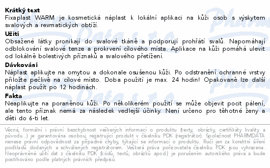 Fixaplast WARM je kosmetická náplast k lokální aplikaci na kůži osob s výskytem svalových a revmatických obtíží.