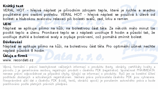 VERAL HOT - hřejivá náplast je přírodním zdrojem tepla, které je rychle a snadno použitelné pro osobní potřebu. VERAL HOT - hřejivá náplast se používá k úlevě od bolesti a hlubokou svalovou relaxaci při bolesti svalů, zad, krku a ramen.