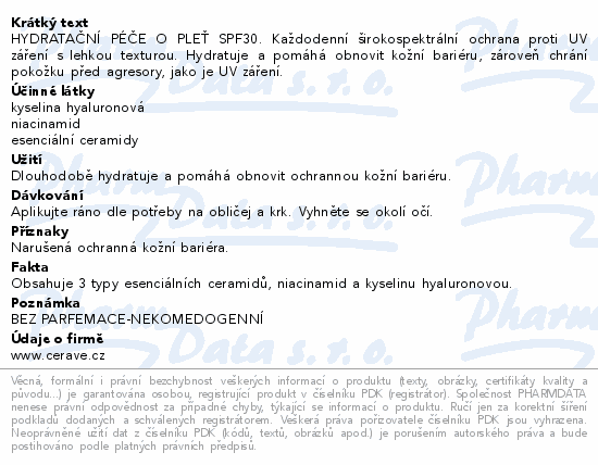 CeraVe Hydratační péče o pleť SPF 30 je denní hydratační krém s ochranným faktorem, určený pro všechny typy pleti, včetně citlivé. Poskytuje kombinaci dlouhodobé hydratace a širokospektrální ochrany proti UVA a UVB záření. Hlavními účinnými složkami jsou ceramidy (1, 3 a 6-II), které posilují kožní bariéru, kyselina hyaluronová, jež pomáhá zadržovat vlhkost v pokožce a Niacinamid navíc přispívá ke zklidnění podráždění a k vyrovnání tónu pleti. Krém má lehký, nemastný a nekomedogenní charakter, rychle se vstřebává a nezanechává bílý film. Je bez parfemace, hypoalergenní a vyvinutý ve spolupráci s dermatology.
