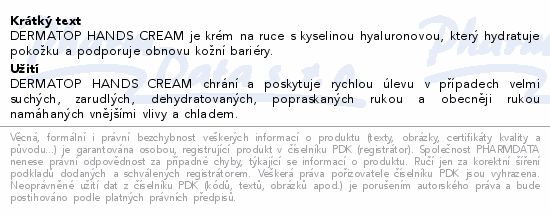 DERMATOP HANDS CREAM je krém na ruce s kyselinou hyaluronovou, který hydratuje pokožku a podporuje obnovu kožní bariéry.