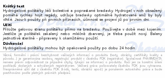 Hydrogelové polštářky léčí bolestivé a popraskané bradavky. Hydrogel v nich obsažený pomáhá rychleji hojit ragády, udržuje bradavky optimálně hydratované aniž by byly vlhké. Jsou-li použity při prvních příznacích, účinnost se projeví již po prvním dni.