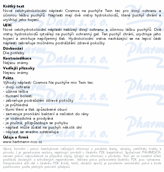 Nové celohydrokoloidní náplasti Cosmos na puchýře Twin tec pro dvojí ochranu a účinnou léčbu puchýřů. Náplasti mají dvě vrstvy hydrokoloidů, které puchýř chrání a urychlují jeho hojení.