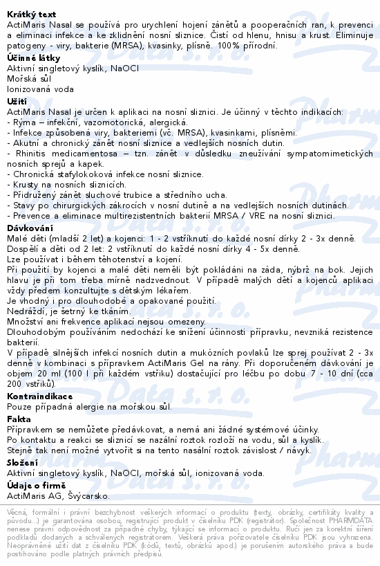 ActiMaris Nasal se používá pro urychlení hojení zánětů a pooperačních ran, k prevenci a eliminaci infekce a ke zklidnění nosní sliznice. Čistí od hlenu, hnisu a krust. Eliminuje patogeny - viry, bakterie (MRSA), kvasinky, plísně. 100% přírodní.