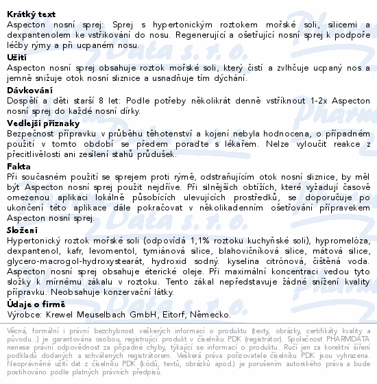 Aspecton nosní sprej: Sprej s hypertonickým roztokem mořské soli, silicemi a dexpantenolem ke vstřikování do nosu. Regenerující a ošetřující nosní sprej k podpoře léčby rýmy a při ucpaném nosu.