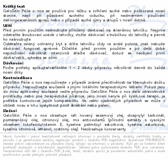 GeloSitin Péče o nos se používá pro léčbu a zvlhčení suché nebo poškozené nosní sliznice, např. při působení suchého vzduchu, při nadměrném používání dekongescenčních sprejů nebo v případě suché rýmy a strupů v nosní dutině.