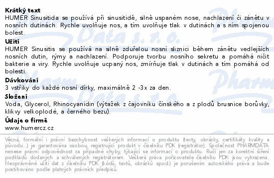 HUMER Sinusitida se používá při sinusitidě, silně uspaném nose, nachlazení či zánětu v nosních dutinách. Rychle uvolňuje nos, a tím uvolňuje tlak v dutinách a s ním spojenou bolest.