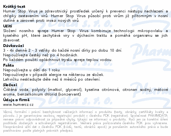 Humer Stop Virus je zdravotnický prostředek určený k prevenci nástupu nachlazení a chřipky zastavením virů. Humer Stop Virus působí proti virům již přítomným v nosní dutině a zároveň proti invazi nových virů.