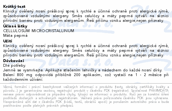 Klinicky ověřený nosní práškový sprej k rychlé a účinné ochraně proti alergické rýmě, způsobované vzdušnými alergeny. Směs celulózy a máty peprné vytváří na sliznici přírodní bariéru proti vzdušným alergenům. Řeší příčinu vzniku alergie,nejen příznaky.