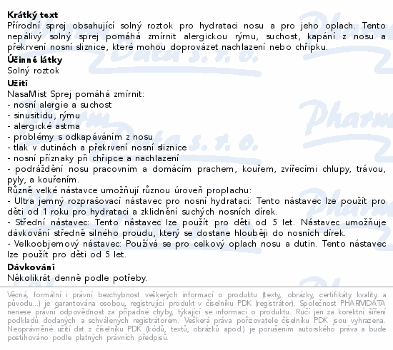 Přírodní sprej obsahující solný roztok pro hydrataci nosu a pro jeho oplach. Tento nepálivý solný sprej pomáhá zmírnit alergickou rýmu, suchost, kapání z nosu a překrvení nosní sliznice, které mohou doprovázet nachlazení nebo chřipku.