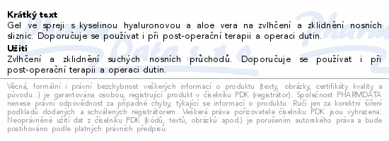 Gel ve spreji s kyselinou hyaluronovou a aloe vera na zvlhčení a zklidnění nosních sliznic. Doporučuje se používat i při post-operační terapii a operaci dutin.