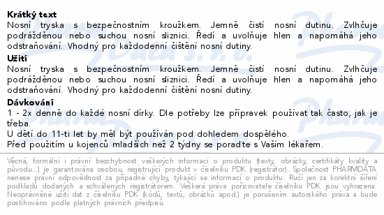 Nosní tryska s bezpečnostním kroužkem. Jemně čistí nosní dutinu. Zvlhčuje podrážděnou nebo suchou nosní sliznici. Ředí a uvolňuje hlen a napomáhá jeho odstraňování. Vhodný pro každodenní čištění nosní dutiny.