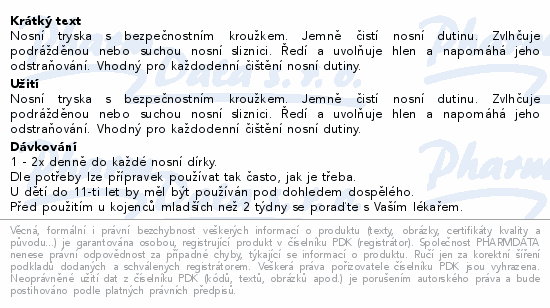 Nosní tryska s bezpečnostním kroužkem. Jemně čistí nosní dutinu. Zvlhčuje podrážděnou nebo suchou nosní sliznici. Ředí a uvolňuje hlen a napomáhá jeho odstraňování. Vhodný pro každodenní čištění nosní dutiny.