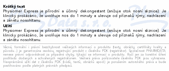 Physiomer Express je přírodní a účinný dekongestant (snižuje otok nosní sliznice). Je klinicky prokázáno, že uvolňuje nos do 1 minuty a ulevuje od příznaků rýmy, nachlazení a zánětu nosohltanu.