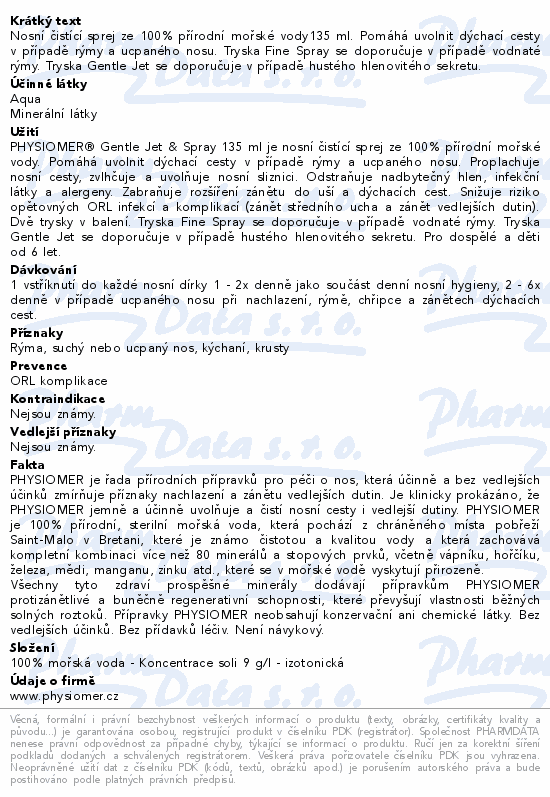 Nosní čistící sprej ze 100% přírodní mořské vody135 ml. Pomáhá uvolnit dýchací cesty v případě rýmy a ucpaného nosu. Tryska Fine Spray se doporučuje v případě vodnaté rýmy. Tryska Gentle Jet se doporučuje v případě hustého hlenovitého sekretu.