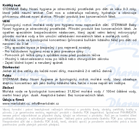 STÉRIMAR Baby Nosní hygiena je zdravotnický prostředek pro děti ve věku 0-3 roky, které ještě neumí smrkat. Čistí nos a odstraňuje nečistoty, hydratuje a obnovuje přirozenou vlhost nosní sliznice. Přírodní produkt bez konzervačních látek.