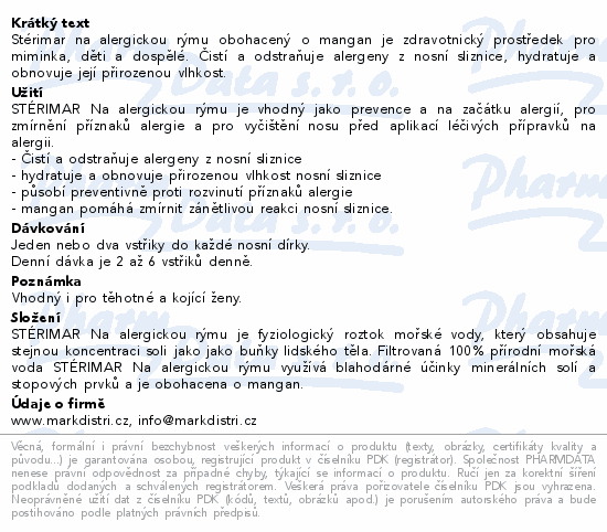 Stérimar na alergickou rýmu obohacený o mangan je zdravotnický prostředek pro miminka, děti a dospělé. Čistí a odstraňuje alergeny z nosní sliznice, hydratuje a obnovuje její přirozenou vlhkost.