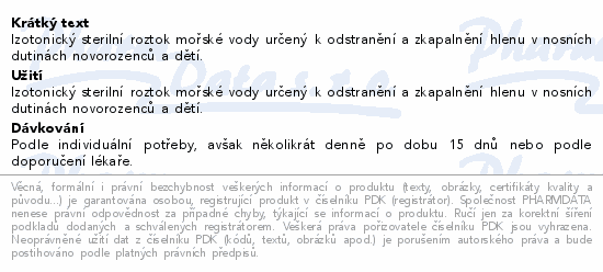 Izotonický sterilní roztok mořské vody určený k odstranění a zkapalnění hlenu v nosních dutinách novorozenců a dětí.