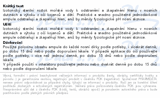Izotonický sterilní roztok mořské vody k odstranění a zkapalnění hlenu v nosních dutinách a výtoku z očí kojenců a dětí. Praktické a snadno použitelné jednodávkové ampule odstraňují a zkapalňují hlen, aniž by měnily fyziologické pH nosní sliznice.