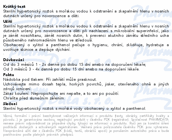 Sterilní hypertonický roztok s mořskou vodou k odstranění a zkapalnění hlenu v nosních dutinách určený pro novorozence a děti.