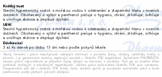 Sterilní hypertonický roztok s mořskou vodou k odstranění a zkapalnění hlenu v nosních dutinách. Obohacený o xylitol a panthenol pečuje o hygienu, chrání, zklidňuje, zvlhčuje a uvolňuje sliznice a zlepšuje dýchání.