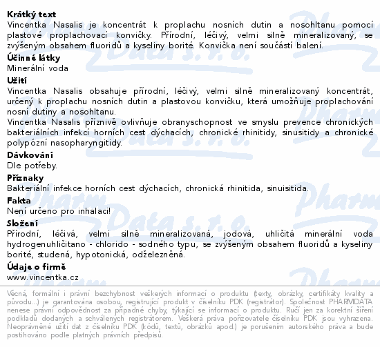 Vincentka Nasalis - koncentrát k proplachu nosních dutin a hosohltanu pomocí plastové proplachovací konvičky. Přírodní, léčivý, velmi silně mineralizovaný, se zvýšeným obsahem fluoridů a kyseliny borité. Konvička není součástí balení.