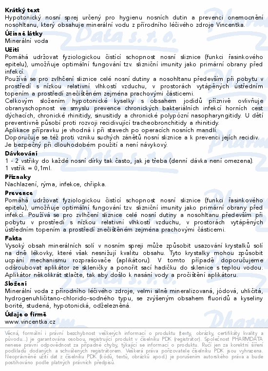 Hypotonický nosní sprej určený pro hygienu nosních dutin a prevenci onemocnění nosohltanu, který obsahuje minerální vodu z přírodního léčivého zdroje Vincentka.