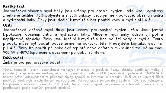 Jednorázové vlhčené mycí žínky jsou určeny pro osobní hygienu těla. Jsou vyrobeny z netkané textilie, 70% polyesteru a 30% viskózy. Jsou jemné k pokožce, obsahují čistící a hydratační látky. Žínky jsou ideální k mytí těla bez použití vody a mýdla.pH 4-5.