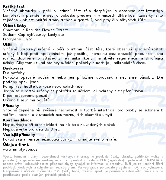 Vlhčené ubrousky k péči o intimní části těla dospělých s obsahem anti-intertrigo komplexu k pravidelné péči o pokožku především v místech vlhké kožní zapářky, a to zejména v oblasti vnitřní strany stehen a genitálií, pod prsy či v záhybech kůže.
