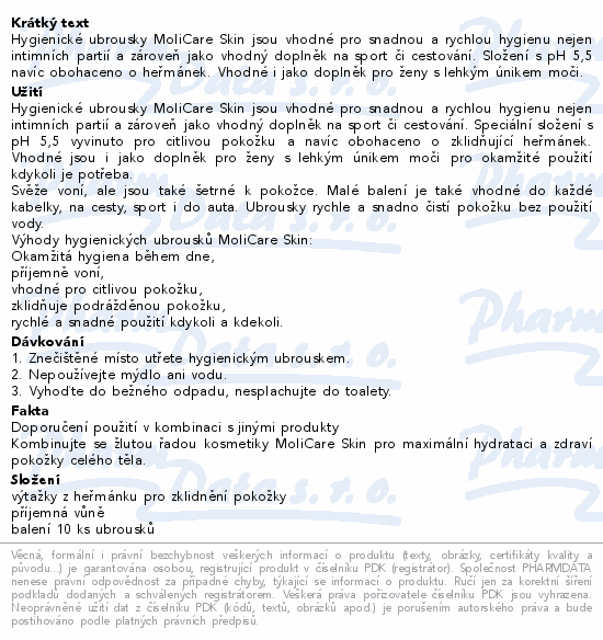 Hygienické ubrousky MoliCare Skin jsou vhodné pro snadnou a rychlou hygienu nejen intimních partií a zároveň jako vhodný doplněk na sport či cestování. Složení s pH 5,5 navíc obohaceno o heřmánek. Vhodné i jako doplněk pro ženy s lehkým únikem moči.