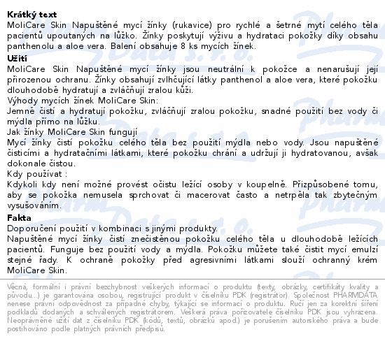 MoliCare Skin Napuštěné mycí žínky (rukavice) pro rychlé a šetrné mytí celého těla pacientů upoutaných na lůžko. Žínky poskytují výživu a hydrataci pokožky díky obsahu panthenolu a aloe vera. Balení obsahuje 8 ks mycích žínek.