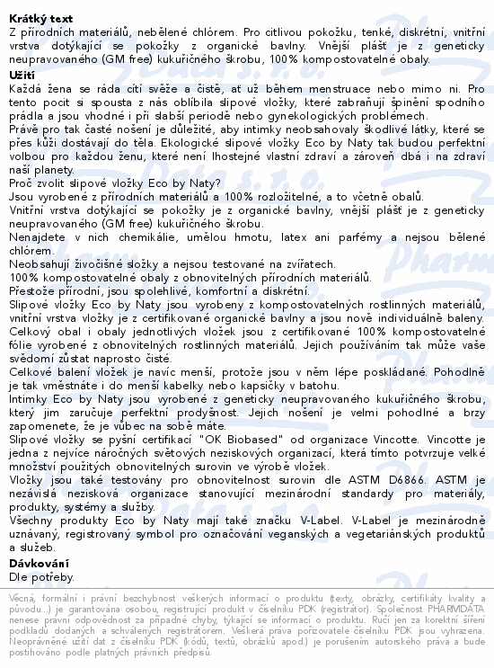 Z přírodních materiálů, nebělené chlórem. Pro citlivou pokožku, tenké, diskrétní, vnitřní vrstva dotýkající se pokožky z organické bavlny. Vnější plášť je z geneticky neupravovaného (GM free) kukuřičného škrobu, 100% kompostovatelné obaly.