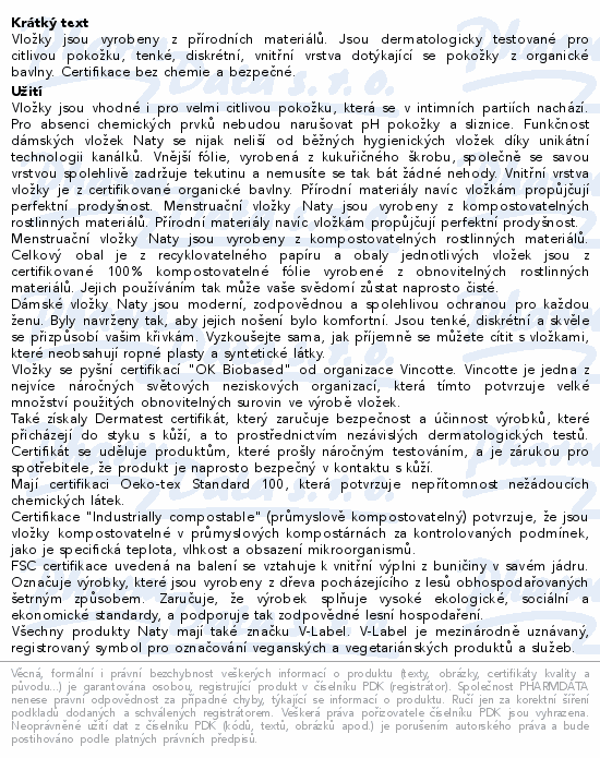Vložky jsou vyrobeny z přírodních materiálů. Jsou dermatologicky testované pro citlivou pokožku, tenké, diskrétní, vnitřní vrstva dotýkající se pokožky z organické bavlny. Certifikace bez chemie a bezpečné.