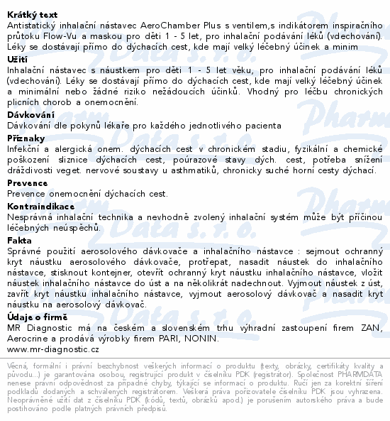 Antistatický inhalační nástavec AeroChamber Plus s ventilem,s indikátorem inspiračního průtoku Flow-Vu a maskou pro děti 1 - 5 let, pro inhalační podávání léků (vdechování). Léky se dostávají přímo do dýchacích cest, kde mají velký léčebný účinek a minim