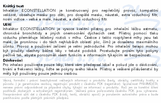 Inhalátor ECONSTELLATION je konstruovaný pro nepřetržitý provoz, kompaktní velikost, obsahuje masku pro děti, pro dospělé masku, náustek, extra vzduchový filtr, nosní vidlice - velké a malé, náustek, a další vzduchový filtr.