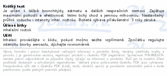 Je určen k léčbě bronchitýdy, astmatu a dalších respiračních nemocí. Zajišťuje maximální pohodlí a efektivnost. Velmi tichý chod s jemnou mlhovinou. Nastavitelný průtok vzduchu i intenzity inhal. roztoku. Bohatá výbava příslušenství. 3 roky záruka.