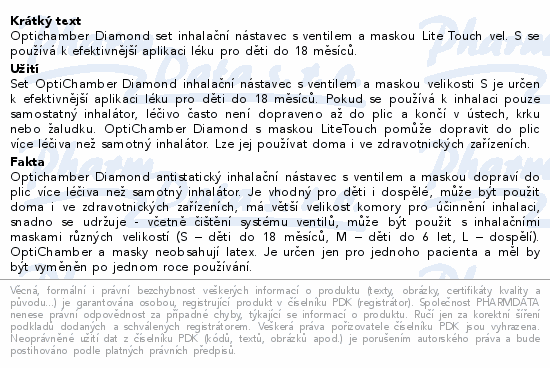 Optichamber Diamond set inhalační nástavec s ventilem a maskou Lite Touch vel. S se používá k efektivnější aplikaci léku pro děti do 18 měsíců.